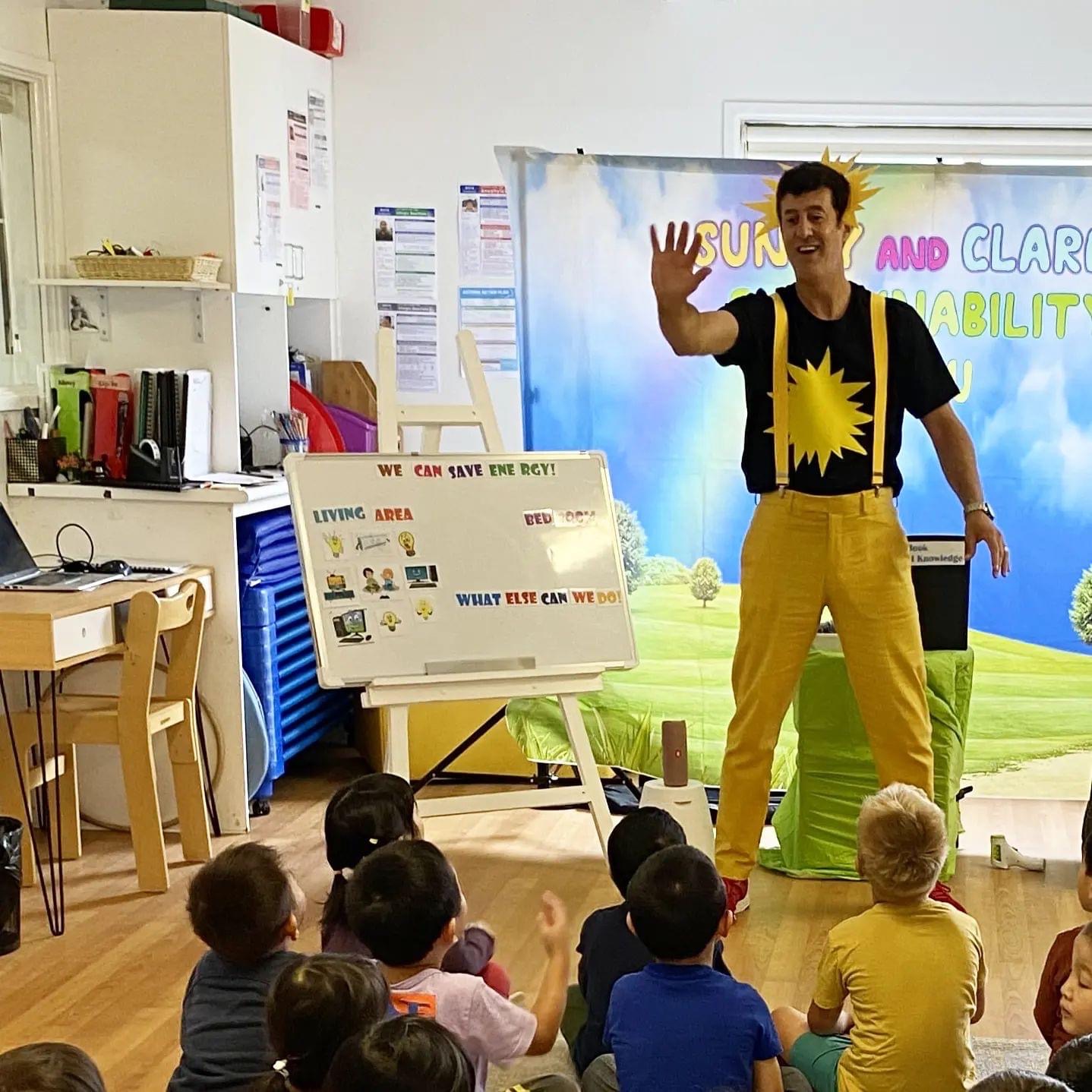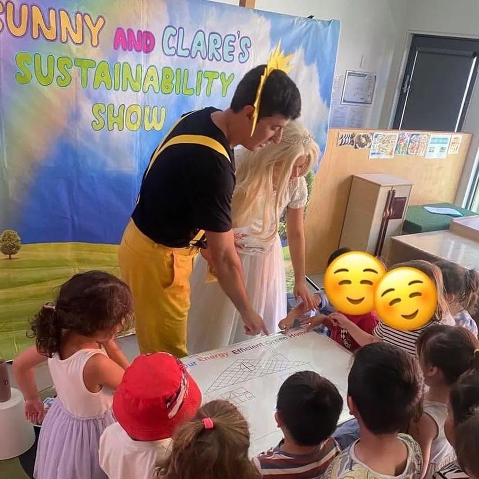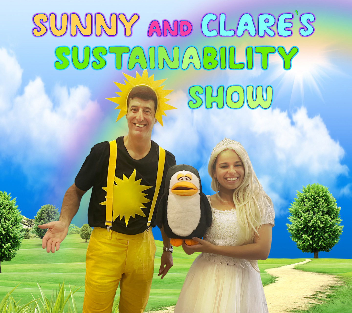 Sunny and Clare’s Sustainability Show – Sunny Sun is overheating due to people not using energy wisely ie – leaving lights and appliances on, using their cars too much. This is causing too much Co2 gases to enter the atmosphere and trapping Sunnys heat. Clare is an ice-princess who has the power to put a smile on children’s faces with her singing prowess. Due to Sunny Sun getting warmer, Clare is starting to melt and this is impacting her strength and therefore her ability to sing. Further to this, Penny the Penguin (Puppet that talks) makes an appearance and explains the impact global warming is having on her environment.